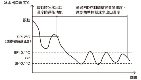 透過電氣箱人機介面的設定,可將機組的消耗電力控制在設定值以內(但冰水出口溫度將會高於標準溫度)。考慮到隨著冰水出口溫度的上升而水頭損失減少,從而將機組回轉數控制到最佳狀態,因此在設定消耗電力條件下可以透過控制,實現更有效的運轉。另外,也可以透過遠端控制的模擬信號進行設定。